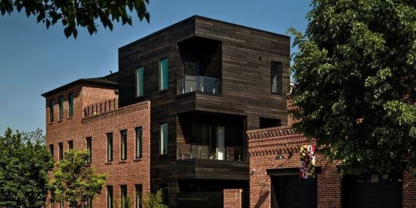 Arbor Wood Burned and Brushed thermally modified pine with a black oil finish truly makes the wood siding stand out on this brick industrial style building